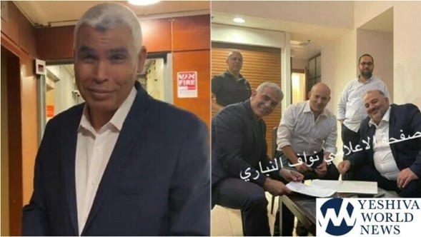 Foto: Ra’am MK Saeed Alkharumi (captura de pantalla); El líder de Yesh Atid, Yair Lapid (izquierda), el líder de Yamina, Naftali Bennett (C), y el líder de Ra’am, Mansour Abbas, firman un acuerdo de coalición el 2 de junio de 2021.