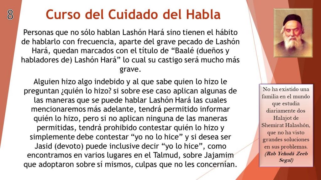 Muchas personas observantes se cuidan excesivamente de que todo lo que entre en su boca tenga la más estricta supervisión rabínica; no comerán nada que provoque la mínima sospecha sobre su procedencia o autorización, y preferirán pasar una tarde en ayunas con tal de no ingerir algún alimento dudoso; pero en lo que se refiere a lo que sale de su boca, la gente tiende a ser menos exigente; habla lo que le viene a la mente y no busca una autorización a todo lo que expresan con su lengua.