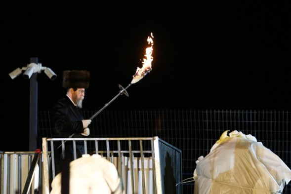 Foto: El Rebe de Boyaner, el rabino Nachum Dov Brayer, enciende la primera hoguera de Lag B’Omer en el monte Meron, el 11 de mayo de 2020.
