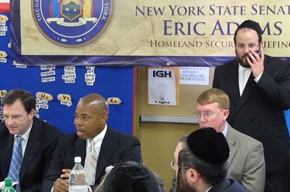 Foto: El entonces senador estatal Eric Adams asiste a una discusión sobre Seguridad Nacional en Borough Park el 25 de mayo de 2009. Su asesor cercano, Joel Eisdorfer, está al teléfono.