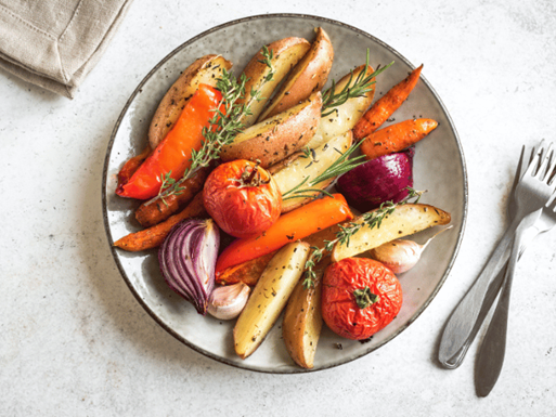 • Áselo en el horno precalentado durante 25 minutos, dándole vuelta una vez a mitad de la cocción. (Las verduras deberían estar comenzando a caramelizarse cuando las retire del horno).