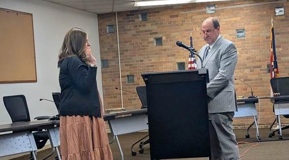 Foto: Michelle Weiss es juramentada como alcaldesa de University Heights, Ohio, por el director de Derecho Brad Bryan en una ceremonia privada, el 31 de diciembre de 2025. (Vía Facebook)