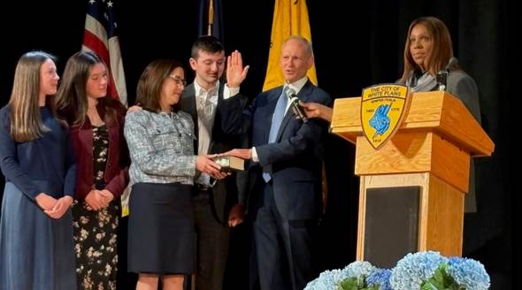 Foto: La familia de Justin Brasch observa su juramentación como alcalde de White Plains, Nueva York, en una ceremonia celebrada en el Auditorio de la Escuela Secundaria de White Plains, el 2 de enero de 2026. (Vía Facebook)