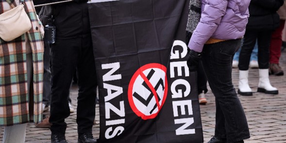 Foto: Manifestación en Schwerin, Alemania, bajo el lema “Todos juntos para proteger la democracia”, con una pancarta que decía “Contra los nazis”. Quieren manifestarse contra las nuevas fronteras en Europa y protestar contra la cooperación con la extrema derecha. Foto: Bernd Wüstneck/dpa vía Reuters Connect.