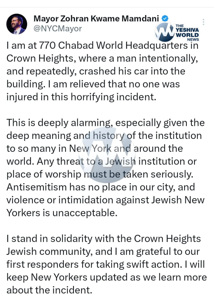 Un hombre fue detenido el miércoles después de embestir repetidamente un vehículo contra la entrada de la sede mundial de Jabad-Lubavitch en 770 Eastern Parkway en Crown Heights.