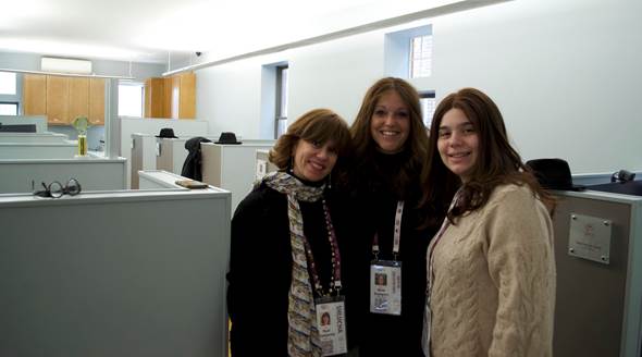 Foto: Perel Krasnjansky (izq.), Dinie Rapoport (centro) y Devorah Leah Kalmenson (der.) posan en las oficinas del movimiento Jabad el 6 de febrero de 2026. (Agencia Telegráfica Judía)
