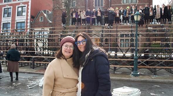 Foto: Chana Kavka (derecha) y Laya Slavin (izquierda) posan frente a la sede de Jabad en Crown Heights, Brooklyn, el 6 de febrero de 2026. (Agencia Telegráfica Judía)