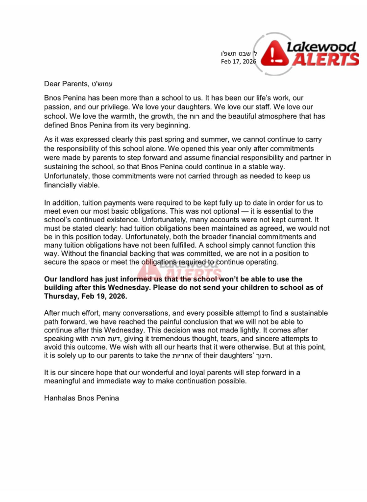 Bnos Penina, una escuela para niñas en Lakewood, ha informado a los padres que ya no podrá operar en su ubicación actual después del miércoles 18 de febrero y ha instruido a las familias a no enviar a sus estudiantes a partir del jueves 19 de febrero