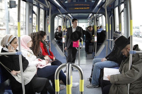 Foto: Judíos y árabes viajan en el Tren Ligero de Jerusalem el 15 de marzo de 2012. Crédito de la foto: Miriam Alster/FLASH90