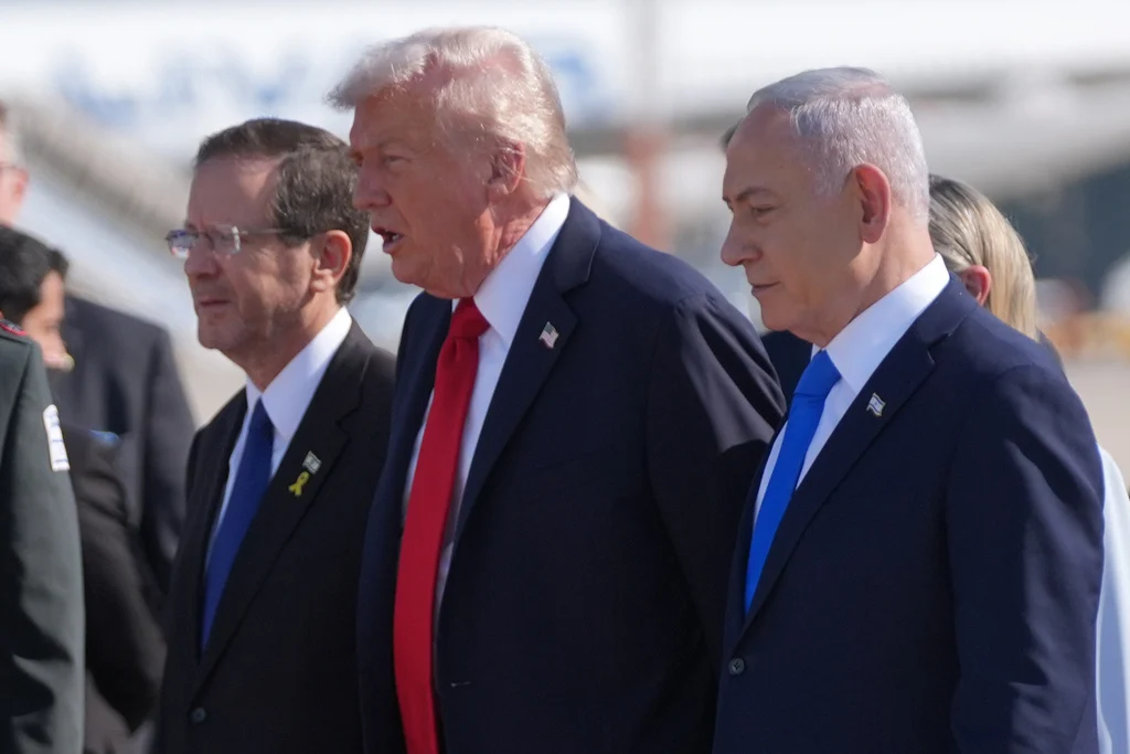 Foto: El presidente estadounidense Donald Trump (centro) camina junto al presidente Isaac Herzog (izquierda) y el primer ministro Benjamin Netanyahu en el aeropuerto Ben Gurion, el 13 de octubre de 2025, cerca de Tel Aviv. (AP/Evan Vucci)
