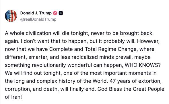 “Toda una civilización morirá esta noche, para no volver jamás”, dijo Trump en una publicación en su plataforma Truth Social.