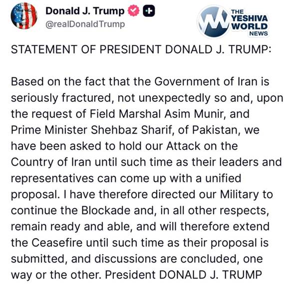 En una publicación de Truth Social en la que anunciaba la extensión del alto el fuego, Trump también dijo que el ejército estadounidense continuaría con el bloqueo de los puertos iraníes.