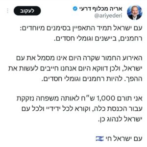 Entre los donantes se encontraba el presidente de Shas, Aryeh Deri, quien escribió: “Am Yisrael siempre se ha caracterizado por sus valores especiales: ser sensatos, humildes y compasivos. Este grave incidente no nos representa, y ahora debemos actuar de manera opuesta: ser sensatos y compasivos. Donaré 1000 NIS a esa familia necesitada para la salvación de Kallah, e insto a todos mis amigos y a todo Am Yisrael a que hagan lo mismo. Am Israel Jai”.